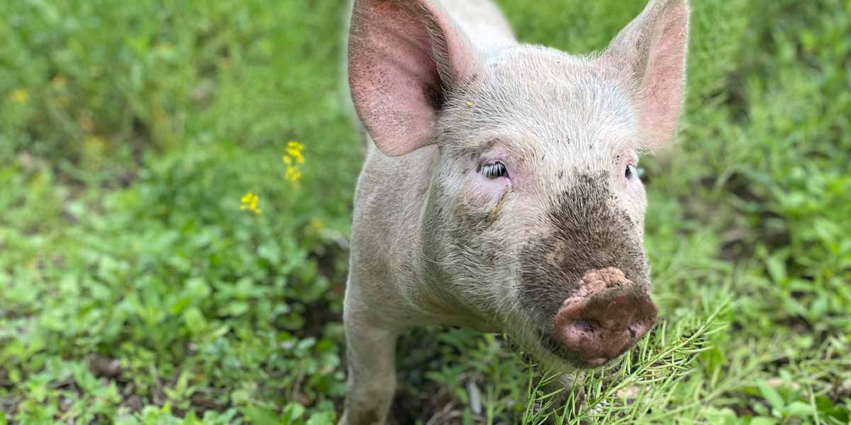 Our pigs live in a stand of birch forest, where they root, roam, and thrive on organic feed and scraps from the garden.